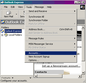 Start first by opening up Outlook Express from the icon on your desktop. Pull down the "Tools" menu and click on "Accounts". This will bring you to the following window to create a new Email profile. Note that the first time you open Outlook Express it may automatically open the new account wizard. If it does, skip right to Step 2. |